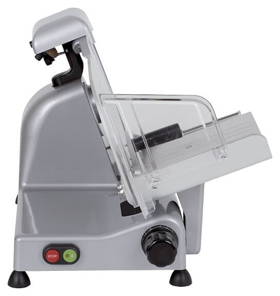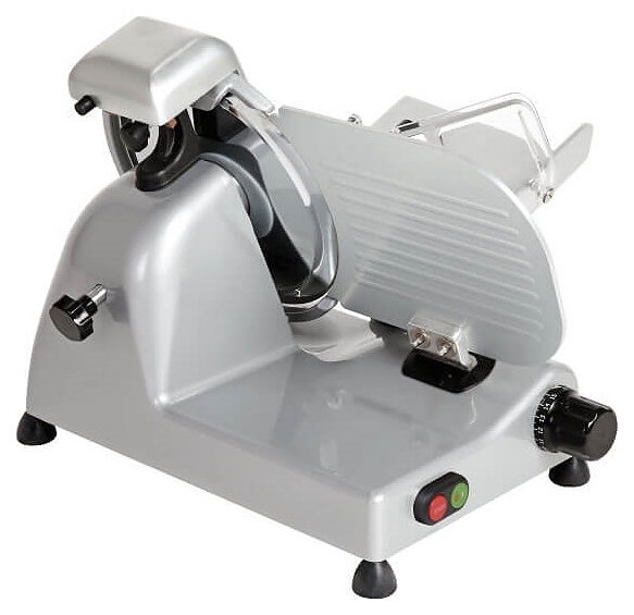 Слайсер RGV Lusso 25 GS Prof предназначен для нарезки мяса, сыров, колбасных изделий, хлеба и других гастрономических изделий на ровные ломтики на предприятиях общественного питания, торговли и пищевой промышленности. Модель оснащена наклонным дисковым ножом. Основание выполнено из алюминия, покрытого пригодной для контакта с пищевыми продуктами краской, лезвие – из закаленной шлифованной стали с твердым хромированным покрытием, крышка ножа, лоток для продуктов и перегородка для регулировки нарезки – из анодированого алюминия с полированным покрытием, защитный экран – из плексигласа.