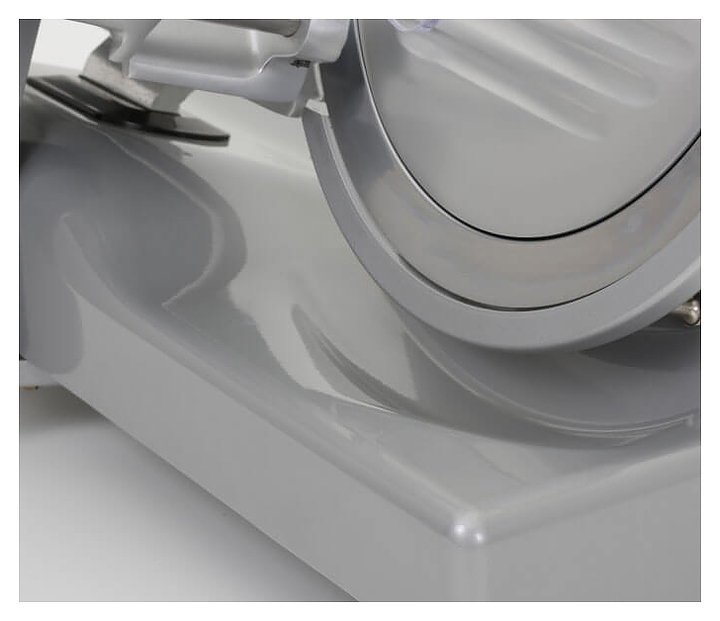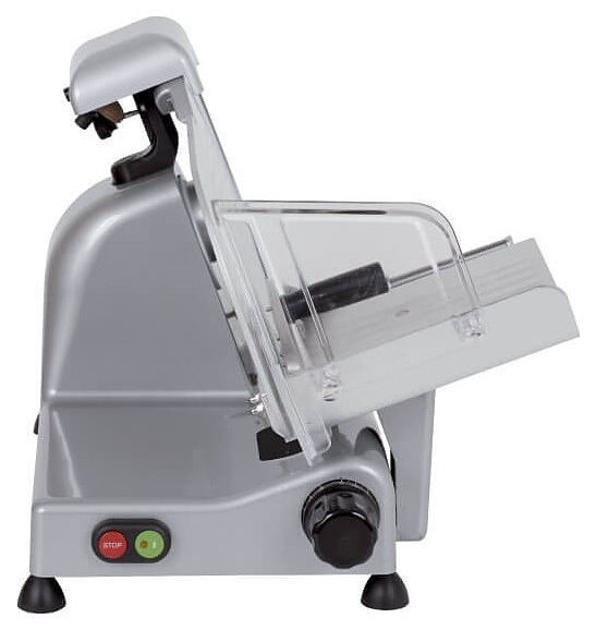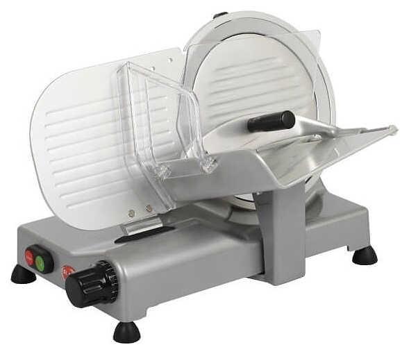 Слайсер RGV Lusso 275 A Prof предназначен для нарезки мяса, сыров, колбасных изделий, хлеба и других гастрономических изделий на ровные ломтики на предприятиях общественного питания, торговли и пищевой промышленности. Модель оснащена наклонным дисковым ножом. Основание выполнено из алюминия, покрытого пригодной для контакта с пищевыми продуктами краской, лезвие – из закаленной шлифованной стали с твердым хромированным покрытием, крышка ножа, лоток для продуктов, перегородка для регулировки нарезки и фиксированное защитное кольцо лезвия – из анодированого алюминия с полированным покрытием, защитный экран – из плексигласа.