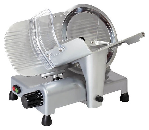 Слайсер RGV Lusso 300 A-L Prof предназначен для нарезки мяса, сыров, рыбы, хлеба и других гастрономических изделий на ровные ломтики на предприятиях общественного питания, торговли и пищевой промышленности. Модель оснащена наклонным дисковым ножом. Основание выполнено из алюминия, покрытого пригодной для контакта с пищевыми продуктами краской, лезвие – из закаленной шлифованной стали с твердым хромированным покрытием, крышка ножа, лоток для продуктов, перегородка для регулировки нарезки и фиксированное защитное кольцо лезвия – из анодированого алюминия с полированным покрытием, защитный экран – из плексигласа.
