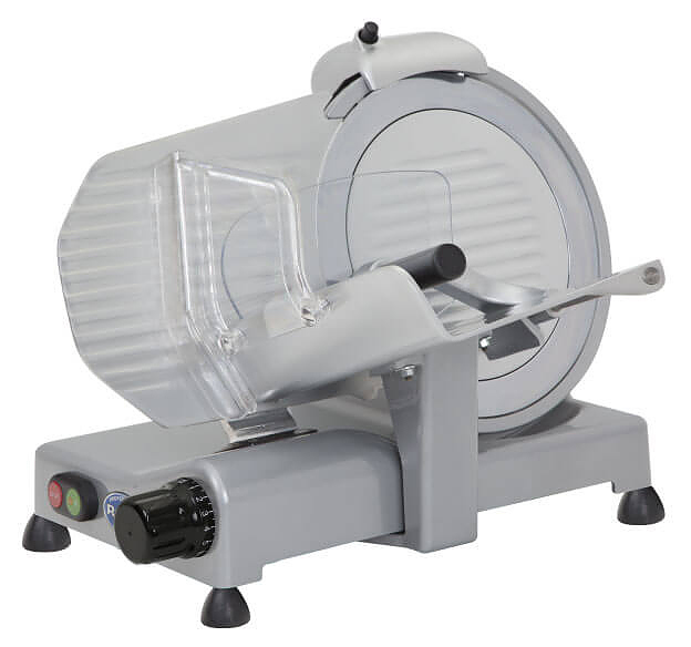 Слайсер RGV Luxury 275/S PROF предназначен для нарезки мяса, сыров, колбасных изделий, хлеба и других гастрономических изделий на ровные ломтики на предприятиях общественного питания, торговли и пищевой промышленности. Модель оснащена встроенным затачивающим устройством. Литой корпус выполнен из окрашенного алюминия, нож - из закаленной стали с тефлоновым покрытием, крышка лезвия и лоток для мяса - из литого анодированного алюминия, держатель - из алюминия.