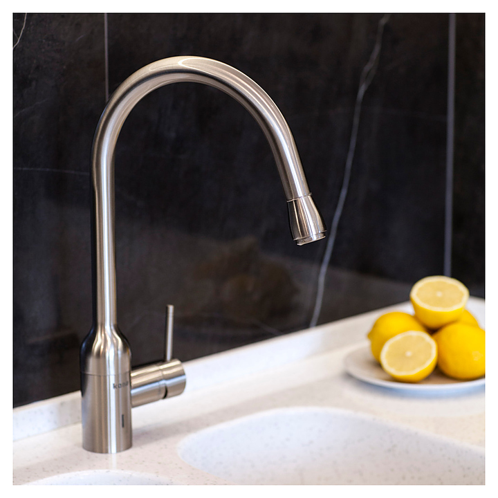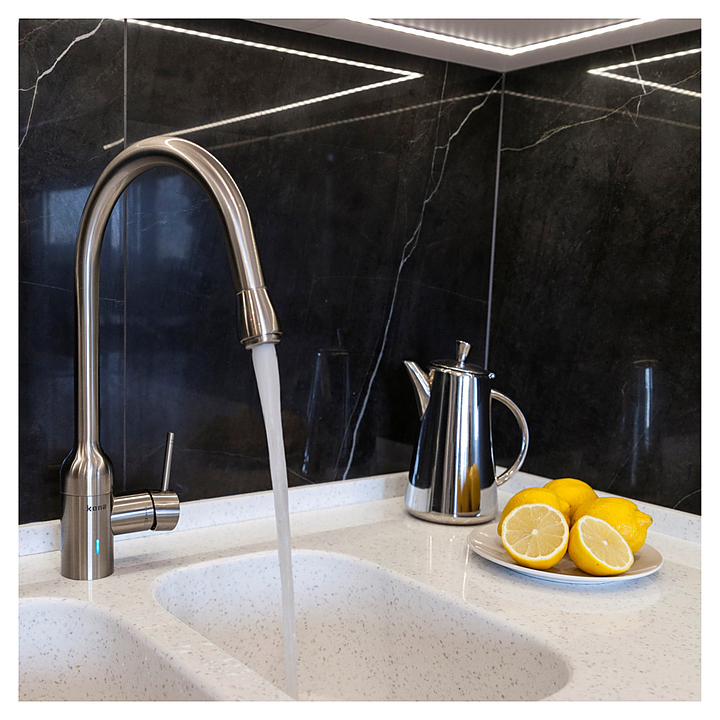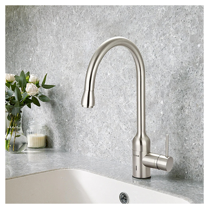 Смеситель-озонатор Kona Ozone SКN-O3-01-SN предназначен для использования в кухонных и ванных помещениях для подачи горячей и холодной воды. Модель оснащена ручкой управления, расположенной сбоку и генератором озона, расположенного под мойкой. Корпус выполнен из высококачественной латуни с матовым никелированным покрытием. Озонирование воды позволяет нейтрализовать хлор и металлы, уничтожить 99,9% микроорганизмов, бактерии и вирусов как в самой воде, так и на поверхностях, которые ею обрабатывают.