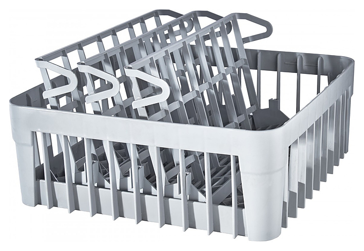 В комплект поставки входят 2 нейтральные кассеты для мытья тарелок, стаканов и чашек, стакан для мытья приборов, держатель тарелок и заливной шланг.