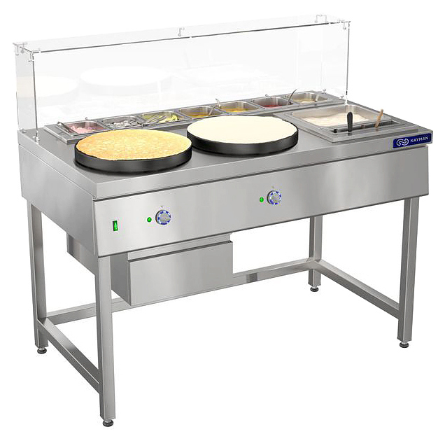 Блинная станция KAYMAN СП-Б-1350 А предназначена для выпекания порционных блинчиков с различными начинками на предприятиях общественного питания и торговли. Модель оснащена 2 встроенными конфорками, 2 съемными холдерами для размещения гастроемкостей под тесто и начинки, а также емкостью под Т-образную лопатку. Корпус выполнен из нержавеющей стали, стойки каркаса - из трубы 40х40 мм нержавеющей стали, жарочные поверхности - из чугуна, обеспечивающего высокие антипригарные свойства и устойчивость к механическим повреждениям.