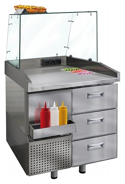 Станция Finist СХ-800-0/3 предназначена кратковременного хранения и обработки ингредиентов, размещения технологического оборудования для приготовления хот-догов на предприятиях общественного питания и торговли. Модель оснащена встроенным агрегатом слева, холодильной камерой с 1 секцией с 3 выдвижными ящиками, столешницей повышенной прочности с охлаждаемым холдером под гастроемкости, прозрачным защитным экраном, 3 розетками, подставкой под 4 стандартные бутылки с соусами, подставкой под готовые хот-доги, устойчивыми опорами с подпятниками, кабелем питания с евровилкой и панелью управления. Корпус выполнен из высококачественной нержавеющей стали.
