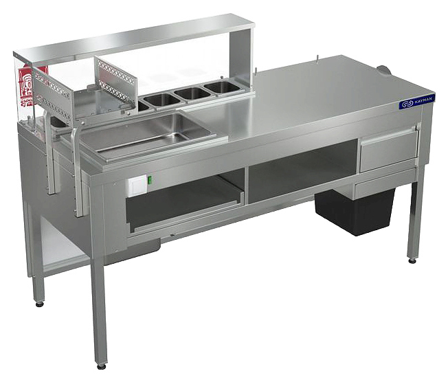 Станция KAYMAN СП-Ш-1800 А предназначена для комплексного оснащения рабочего места приготовления и продажи шаурмы, а также для хранения предварительно охлажденных мясных полуфабрикатов, хлебобулочных изделий, начинок и соусов на предприятиях общественного питания и торговли. Модель оснащена столешницей для установки гриля для шаурмы, холдерами для размещения гастроемкостей с ингедиентами для шаурмы и регулируемой по высоте полкой для установки контактного гриля. Все конструктивные элементы выполнены из нержавеющей стали.