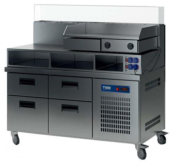Модульная станция ТММ СХСБ-СМ-1/4Я используется на предприятиях общественного питания и торговли для обработки ингредиентов для приготовления бургеров и кратковременного хранения готовой продукции. Надстройка обеспечивает легкий доступ к используемым компонентам. Модель оснащена 3-сторонним закаленным стеклом. Цельнозаливной корпус и фасад выполнены из нержавеющей стали.