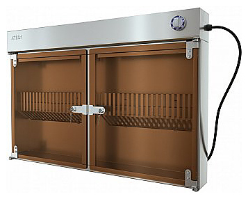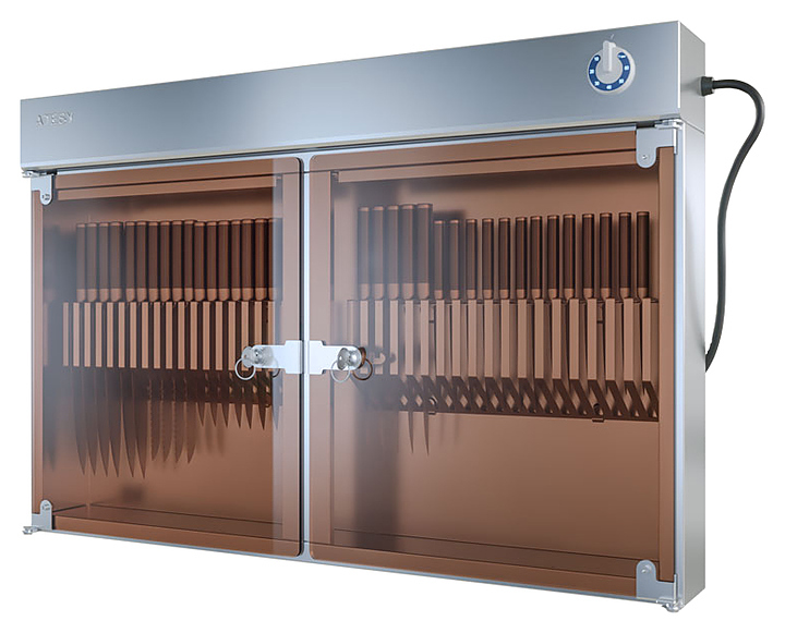 Стерилизатор ATESY СТУ-2-36-02-1 предназначен для обеззараживания ножей и других инструментов на предприятиях общественного питания и торговли. Модель оснащена бактерицидными лампами низкого давления, таймером и замком для сохранности ножей. Корпус выполнен из нержавеющей стали AISI430, дверь - из тонированного стекла, держатель - из нержавеющей стали, колба - из увиолевого стекла.