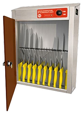Стерилизатор для ножей Koneteollisuus Oy (KT)? 725 предназначен для дезинфекции столовых приборов на предприятиях пищевой промышленности и торговли. Модель с ультрафиолетовой обработкой оснащена кнопкой включения, цифровым таймером и наклонным держателем. Корпус выполнен из нержавеющей стали AISI 304, дверца - из ПВХ.