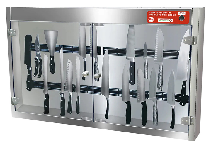 Стерилизатор для ножей Koneteollisuus Oy (KT) 921 предназначен для дезинфекции столовых приборов на предприятиях пищевой промышленности и торговли. Модель оснащена 4 магнитными держателями, кнопкой включения озонового генератора и цифровым таймером. Корпус выполнен из нержавеющей стали AISI 304, дверца - из ПВХ.