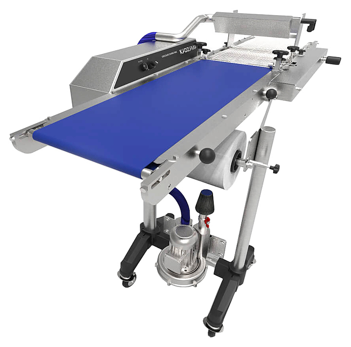 Стол используется совместно с темперирующими машинами Kadzama с загрузкой 30 и 60 кг для глазирования шоколадом конфет, печенья и бисквитов на предприятиях общественного питания и торговли. Модель оснащена колесами и механизмом складывания для компактного хранения.