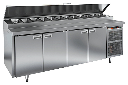 Стол для пиццы HICOLD PZ1-1111/GN используется на предприятиях общественного питания и торговли для раскатки теста и обработки ингредиентов, используемых для приготовления пиццы, салатов и других блюд, а также для охлаждения и кратковременного хранения скоропортящихся продуктов и напитков. Модель совмещает в себе рабочую поверхность и охлаждаемый объем, что значительно упрощает работу повара, так как все необходимые компоненты всегда находятся под рукой. Корпус и столешница выполнены из нержавеющей стали.