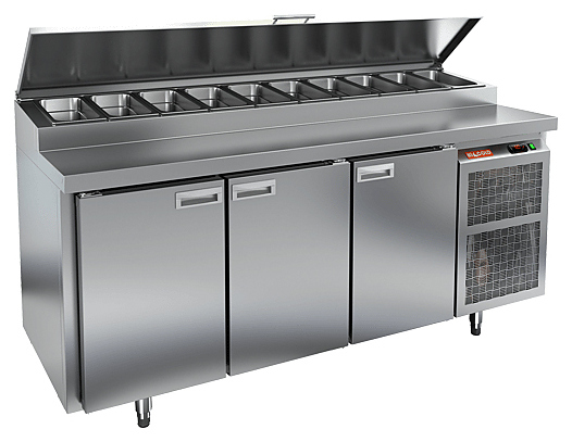Стол для пиццы HICOLD PZ1-111/GN используется на предприятиях общественного питания и торговли для раскатки теста и обработки ингредиентов, используемых для приготовления пиццы, салатов и других блюд, а также для охлаждения и кратковременного хранения скоропортящихся продуктов и напитков. Модель совмещает в себе рабочую поверхность и охлаждаемый объем, что значительно упрощает работу повара, так как все необходимые компоненты всегда находятся под рукой. Корпус и столешница выполнены из нержавеющей стали.