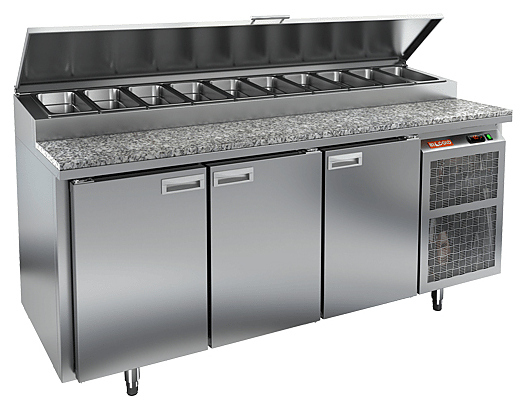 Стол для пиццы HICOLD PZ1-111/GN используется на предприятиях общественного питания и торговли для раскатки теста и обработки ингредиентов, используемых для приготовления пиццы, салатов и других блюд, а также для охлаждения и кратковременного хранения скоропортящихся продуктов и напитков. Модель совмещает в себе рабочую поверхность и охлаждаемый объем, что значительно упрощает работу повара, так как все необходимые компоненты всегда находятся под рукой. Корпус выполнен из нержавеющей стали, столешница - из гранита.