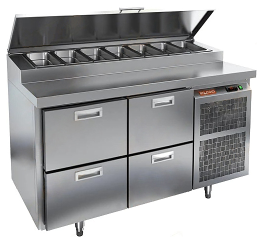 Стол для пиццы HICOLD PZ2-22/GN используется на предприятиях общественного питания и торговли для раскатки теста и обработки ингредиентов, используемых для приготовления пиццы, салатов и других блюд, а также для охлаждения и кратковременного хранения скоропортящихся продуктов и напитков. Модель совмещает в себе рабочую поверхность и охлаждаемый объем, что значительно упрощает работу повара, так как все необходимые компоненты всегда находятся под рукой. Корпус и столешница выполнены из нержавеющей стали.