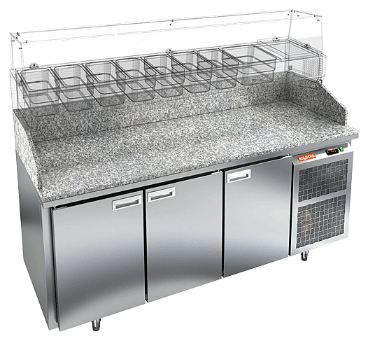 Стол для пиццы HICOLD PZ3-111/GN используется на предприятиях общественного питания и торговли для раскатки теста и обработки ингредиентов, используемых для приготовления пиццы, салатов и других блюд, а также для охлаждения и кратковременного хранения скоропортящихся продуктов и напитков. Модель совмещает в себе рабочую поверхность и охлаждаемый объем, что значительно упрощает работу повара, так как все необходимые компоненты всегда находятся под рукой. Корпус выполнен из нержавеющей стали, столешница - из гранита.