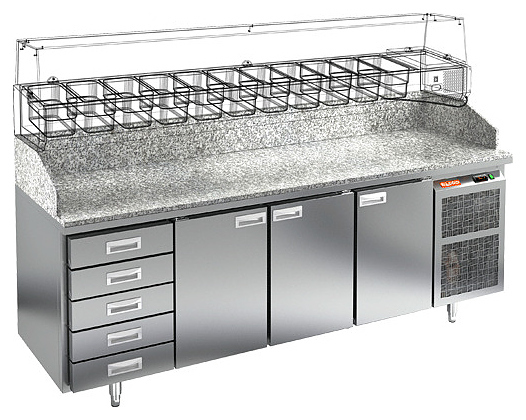 Стол для пиццы HICOLD PZ4-111/GN используется на предприятиях общественного питания и торговли для раскатки теста и обработки ингредиентов, используемых для приготовления пиццы, салатов и других блюд, а также для охлаждения и кратковременного хранения скоропортящихся продуктов и напитков. Модель совмещает в себе рабочую поверхность и охлаждаемый объем, оснащена нейтральным модулем на 5 выдвижных ящиков с контейнерами для теста. Корпус выполнен из нержавеющей стали, столешница - из гранита.