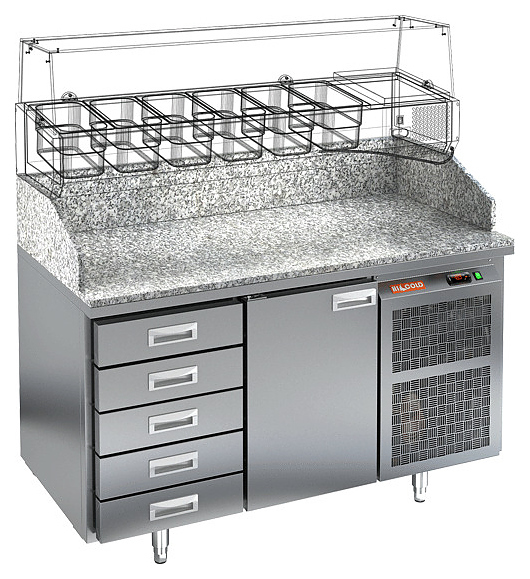 Стол для пиццы HICOLD PZ4-1/GN используется на предприятиях общественного питания и торговли для раскатки теста и обработки ингредиентов, используемых для приготовления пиццы, салатов и других блюд, а также для охлаждения и кратковременного хранения скоропортящихся продуктов и напитков. Модель совмещает в себе рабочую поверхность и охлаждаемый объем, оснащена нейтральным модулем на 5 выдвижных ящиков с контейнерами для теста. Корпус выполнен из нержавеющей стали, столешница - из гранита.