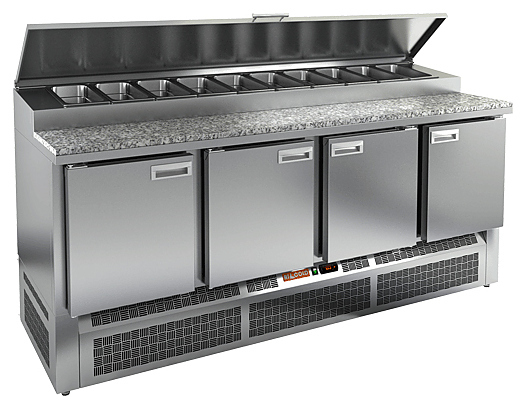 Стол для пиццы HICOLD PZE1-1111/GN используется на предприятиях общественного питания и торговли для раскатки теста и обработки ингредиентов, используемых для приготовления пиццы, салатов и других блюд, а также для охлаждения и кратковременного хранения скоропортящихся продуктов и напитков. Модель совмещает в себе рабочую поверхность и охлаждаемый объем, что значительно упрощает работу повара, так как все необходимые компоненты всегда находятся под рукой. Корпус выполнен из нержавеющей стали, столешница - из гранита.