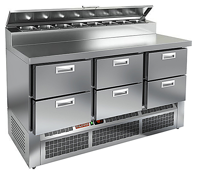 Стол для пиццы HICOLD PZE2-222/GN используется на предприятиях общественного питания и торговли для раскатки теста и обработки ингредиентов, используемых для приготовления пиццы, салатов и других блюд, а также для охлаждения и кратковременного хранения скоропортящихся продуктов и напитков. Модель совмещает в себе рабочую поверхность и охлаждаемый объем, что значительно упрощает работу повара, так как все необходимые компоненты всегда находятся под рукой. Корпус и столешница выполнены из нержавеющей стали.