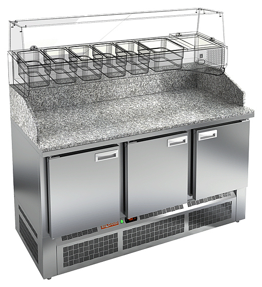 Стол для пиццы HICOLD PZE3-111/SN используется на предприятиях общественного питания и торговли для раскатки теста и обработки ингредиентов, используемых для приготовления пиццы, салатов и других блюд, а также для охлаждения и кратковременного хранения скоропортящихся продуктов и напитков. Модель совмещает в себе рабочую поверхность и охлаждаемый объем, что значительно упрощает работу повара, так как все необходимые компоненты всегда находятся под рукой. Корпус выполнен из нержавеющей стали, столешница - из гранита.