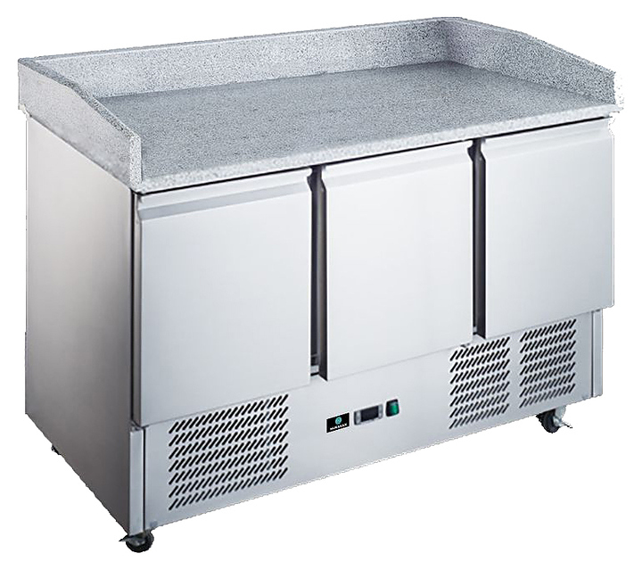 Стол для пиццы HURAKAN HKN-PZLG3F предназначен для раскатки теста, обработки ингредиентов для приготовления блюд, охлаждения и хранения продуктов на предприятиях общественного питания и торговли. Модель оснащена системой статического охлаждения с вспомогательным вентилятором и бортом.