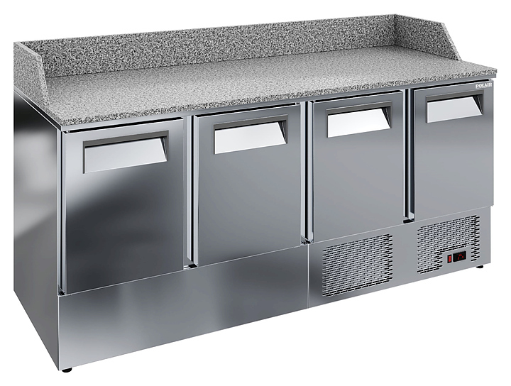 Холодильный стол для пиццы POLAIR TMi4pizza-GC предназначен для раскатки теста, хранения продуктов и обработки ингредиентов для приготовления пиццы на рабочей поверхности на предприятиях общественного питания и торговли. Внешняя (кроме задней стенки) и внутренняя обшивка цельнозаливного корпуса и двери выполнены из нержавеющей стали и обеспечивают механическую прочность, термоизоляцию, герметичность и долговечность стола, столешница и борт - из натурального гранита, теплоизоляция - из пенополиуретана. Оборудование рассчитано на работу при температуре окружающей среды до 43 °С.