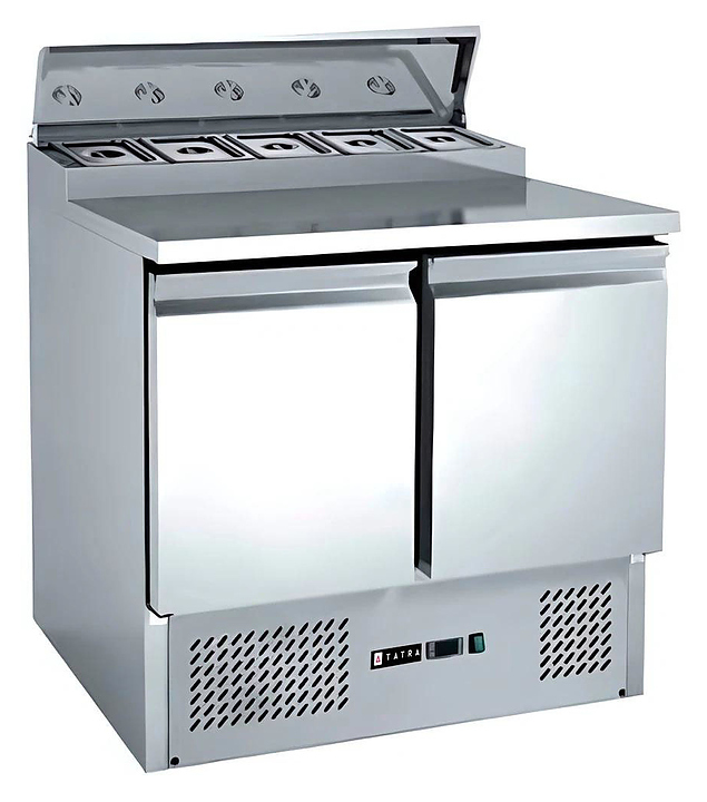 Стол Tatra TPZGNL2 VC предназначен для приготовления пиццы на предприятиях общественного питания и торговли. Модель оснащена встроенным холодильным агрегатом с нижним расположением, цифровым термостатом, 2 глухими дверьми с магнитным уплотнителем, отделением для гастроемкостей с крышкой и регулирумыми по высоте ножками. Корпус выполнен из высококачественной нержавеющей стали, столешница - из камня, крышка - из металла.