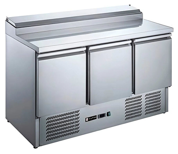 Стол Tatra TPZGNL3 VC предназначен для приготовления пиццы на предприятиях общественного питания и торговли. Модель оснащена встроенным холодильным агрегатом с нижним расположением, цифровым термостатом, 3 глухими дверьми с магнитным уплотнителем, отделением для гастроемкостей с крышкой и регулирумыми по высоте ножками. Корпус и столешница выполнены из высококачественной нержавеющей стали, крышка - из металла.