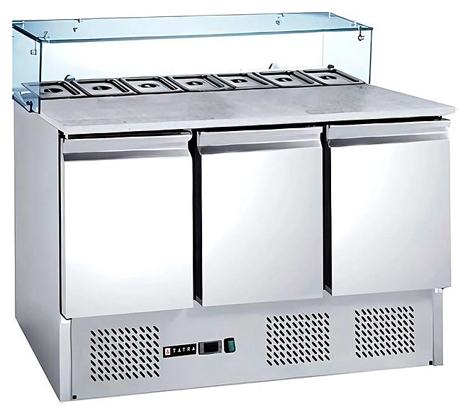 Стол Tatra TPZGNL3 VG ST предназначен для приготовления пиццы на предприятиях общественного питания и торговли. Модель оснащена встроенным холодильным агрегатом с нижним расположением, цифровым термостатом, 3 глухими дверьми с магнитным уплотнителем, отделением для гастроемкостей с козырьком и регулирумыми по высоте ножками. Корпус выполнен из высококачественной нержавеющей стали, столешница - из камня, козырек - из стекла.