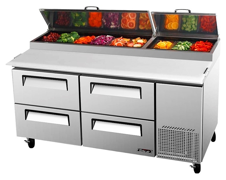 Стол для пиццы Turbo air CTPR-67-2D-4 состоит из разделочной доски, на которой можно обрабатывать ингредиенты, и камеры, предназначенной для охлаждения и кратковременного хранения продуктов для приготовления пиццы на предприятиях пищевой промышленности, общественного питания и торговли. Модель оснащена 4 ящиками и 4 колесами фронтальными со стопорами. Корпус выполнен из нержавеющей стали (гальванизированная сталь на оборотной стороне и внизу) с применением пожаробезопасных стенок толщиной 60 мм, уплотнения - из АБС-пластика, который улучшает теплоизоляцию и не пропускает конденсат, пол - из нержавеющей стали с алюминиевыми вставками по бокам и сзади, двери собственной конструкции оснащены петлями из высококачественной нержавеющей стали, разделочная доска - из полиэтилена низкой плотности высокого давления.
