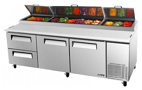 Стол для пиццы Turbo air CTPR-93-2D-2 предназначен для раскатки теста, хранения продуктов и обработки ингредиентов для приготовления пиццы на рабочей поверхности на предприятиях общественного питания. Модель оснащена 2 дверцами, 2 ящиками, эргономичными ручками и 6 колесами. Корпус выполнен из нержавеющей стали (гальванизированная сталь на оборотной стороне и внизу), уплотнения - из ABS-пластика, пол - из нержавеющей стали с алюминиевыми вставками по бокам и сзади, тройные направляющие ящиков и дверные петли - из нержавеющей стали, разделочная доска - из пищевого полиэтилена LDPE