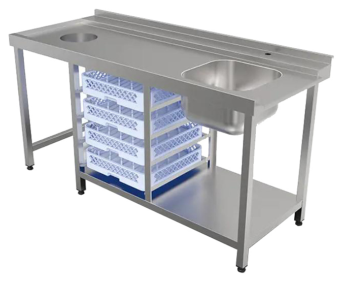 Входной стол для посудомоечной машины Кобор СПМ/1-170/70/П используется на предприятиях общественного питания и торговли. Модель оснащена бортом, отверстием под смеситель, полкой в нижней части, отверстием для сбора отходов и 4 уровнями направляющих для посудомоечных кассет. Сварной каркас выполнен из нержавеющей трубы, столешница - из нержавеющей стали AISI 430, усиление - из ЛДСП.