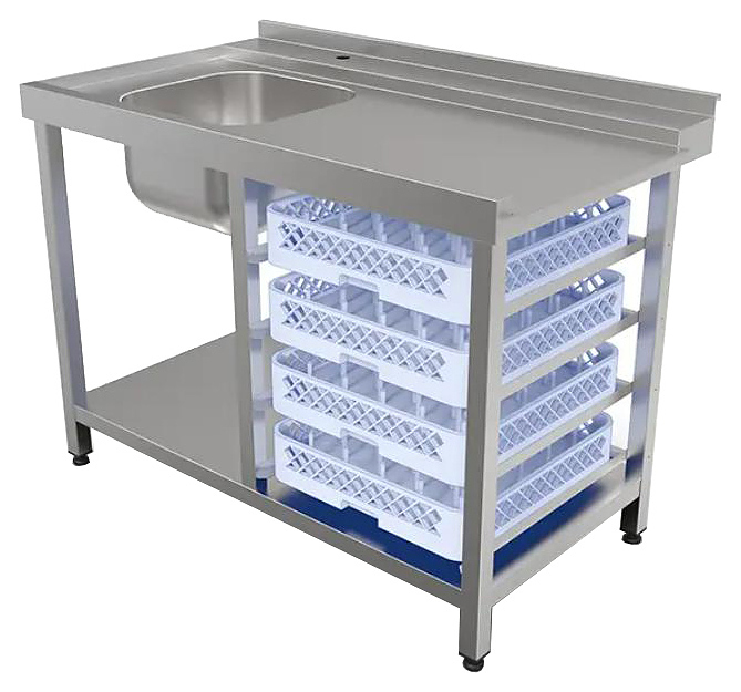 Входной стол для посудомоечной машины Кобор СПМ/3-120/70/Л используется на предприятиях общественного питания и торговли. Модель оснащена бортом, отверстием под смеситель, полкой в нижней части и 4 уровнями направляющих для посудомоечных кассет. Сварной каркас выполнен из нержавеющей трубы, столешница - из нержавеющей стали AISI 430, усиление - из ЛДСП.