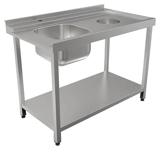 Входной стол для посудомоечной машины Кобор СПМ/4-120/70/Л используется на предприятиях общественного питания и торговли. Модель оснащена бортом, отверстием под смеситель, полкой в нижней части и отверстием для сбора отходов. Сварной каркас выполнен из нержавеющей трубы, столешница - из нержавеющей стали AISI 430, усиление - из ЛДСП.
