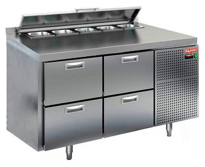 Стол для салатов HICOLD SL2-22GN (1/6) используется на предприятиях общественного питания и торговли для хранения и обработки ингредиентов, используемых для приготовления пиццы, салатов и других блюд, а также для охлаждения и кратковременного хранения скоропортящихся продуктов и напитков. Модель совмещает в себе рабочую поверхность с бортом и 4 выдвижных ящика, что значительно упрощает работу повара, так как все необходимые компоненты всегда находятся под рукой. Корпус и столешница выполнены из нержавеющей стали, задняя стенка стола - из оцинкованной стали.