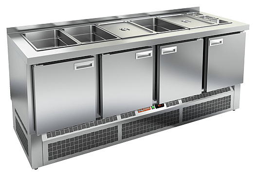 Стол для салатов HICOLD SLE3-1111GN используется на предприятиях общественного питания и торговли для охлаждения и кратковременного хранения ингредиентов, используемых для приготовления салатов, закусок и сэндвичей, а также других скоропортящихся продуктов и напитков. Корпус и столешница выполнены из нержавеющей стали.