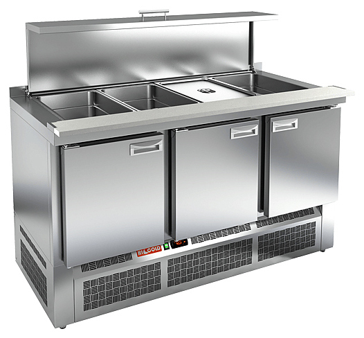 Стол для салатов HICOLD SLE3-111GN используется на предприятиях общественного питания и торговли для охлаждения и кратковременного хранения ингредиентов, используемых для приготовления салатов, закусок и сэндвичей, а также других скоропортящихся продуктов и напитков. Корпус выполнен из нержавеющей стали, столешница - из полипропилена.