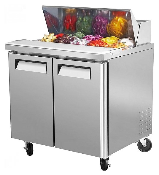 Стол для сбора сэндвичей Turbo air CMST-36 предназначен для кратковременного хранения и нарезки ингредиентов для бургеров и для сборки готовых продуктов на предприятиях общественного питания и торговли. Модель оснащена 2 дверцами с эргономичными ручками, 2 полками и 4 колесами. Корпус выполнен из нержавеющей стали (гальванизированная сталь на оборотной стороне и внизу), уплотнения - из ABS-пластика, пол - из нержавеющей стали с алюминиевыми вставками по бокам и сзади оборудования, регулируемые полки - из толстой стальной проволоки с виниловым покрытием, дверные петли - из высококачественной нержавеющей стали, разделочная доска - из пищевого полиэтилена низкой плотности высокого давления.