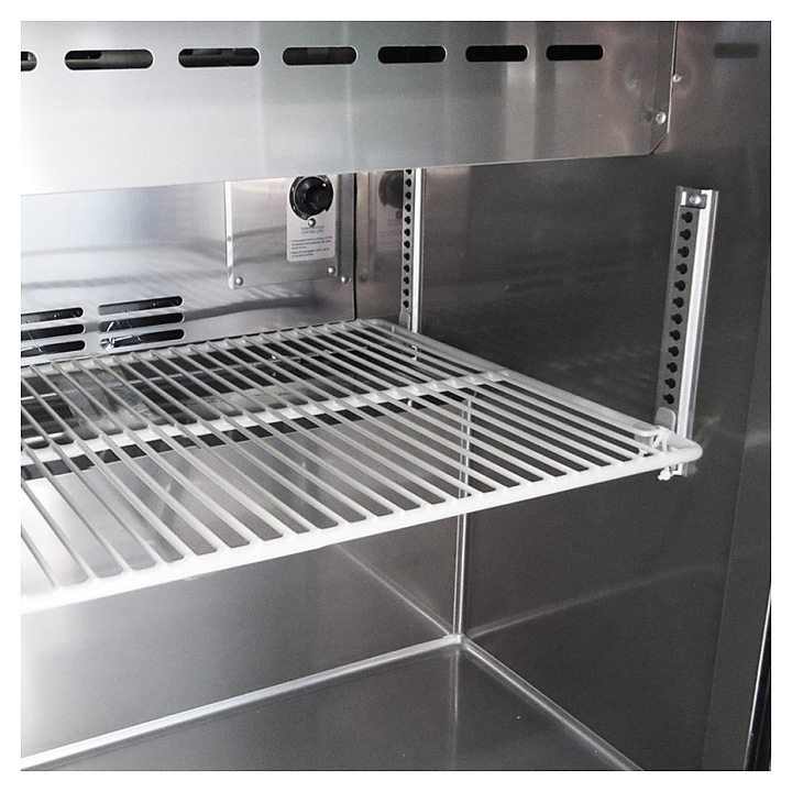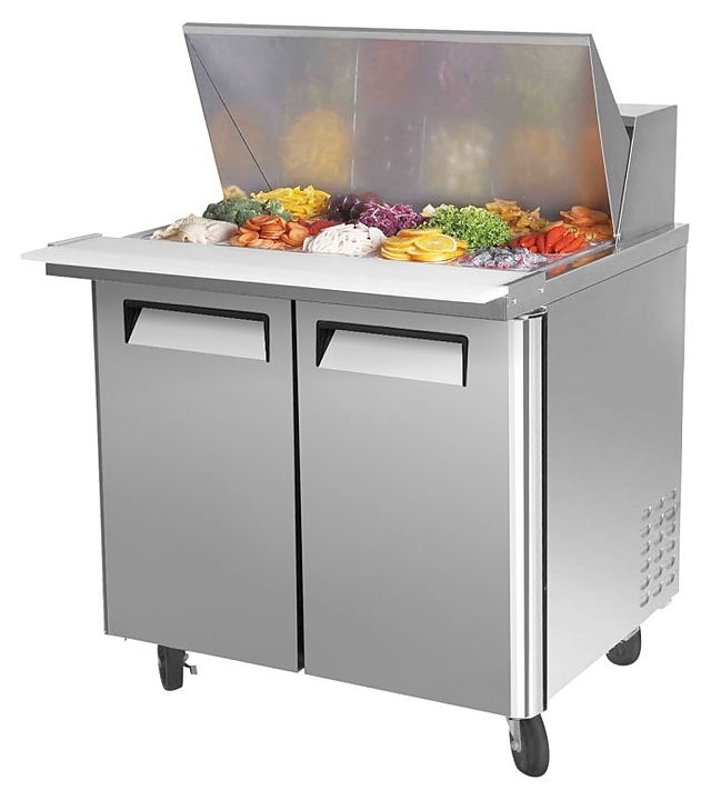 Стол для сбора сэндвичей Turbo air CMST-36-15 предназначен для кратковременного хранения и нарезки ингридиентов для бургеров и для сборки готовых продуктов на предприятиях общественного питания и торговли. Модель оснащена 1 полкой и 4 фронтальными колесами со стопорами. Корпус выполнен из нержавеющей стали (гальванизированная сталь на оборотной стороне и внизу) с применением пожаробезопасных стенок толщиной 60 мм, уплотнения - из АБС-пластика, который улучшает теплоизоляцию и не пропускает конденсат, пол - из нержавеющей стали с алюминиевыми вставками по бокам и сзади оборудования, регулируемые полки - из толстой стальной проволоки с виниловым покрытием, двери собственной конструкции оснащены петлями из высококачественной нержавеющей стали, разделочная доска - из пищевого полиэтилена низкой плотности высокого давления.