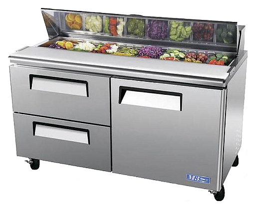 Холодильный стол Turbo air CMST-48-2D-2 используется на предприятиях общественного питания и торговли для обработки ингредиентов, используемых для приготовления сэндвичей, охлаждения и кратковременного хранения продуктов. Модель оснащена эргономичными ручками и 4 колесами. Корпус, направляющие и дверные петли выполнены из нержавеющей стали, пол - из нержавеющей стали с алюминевыми вставками по бокам и сзади, разделочная доска - из пищевого полиэтилена LDPE, уплотнение - из ABS пластика, полки - из стальной проволоки с виниловым покрытием.