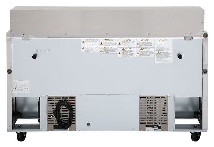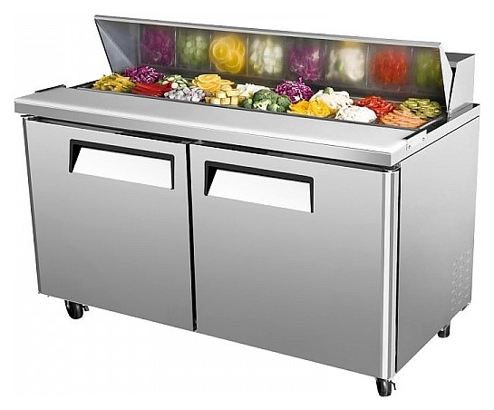 Холодильный стол Turbo air CMST-60 используется на предприятиях общественного питания и торговли для обработки ингредиентов, используемых для приготовления сэндвичей, охлаждения и кратковременного хранения продуктов. Модель оснащена эргономичными ручками и 4 колесами. Корпус и дверные петли выполнены из нержавеющей стали, пол - из нержавеющей стали с алюминевыми вставками по бокам и сзади, разделочная доска - из пищевого полиэтилена LDPE, уплотнение - из ABS пластика, полки - из стальной проволоки с виниловым покрытием.