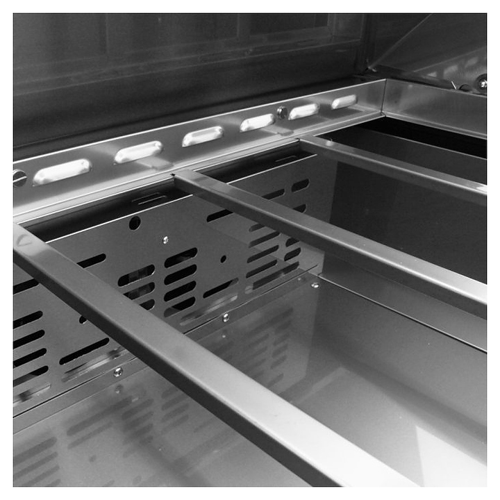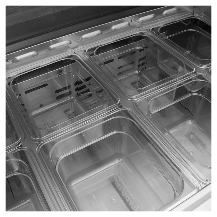 - Система охлаждения гастроемкостей распределяет холодный воздух по всей площади гастроемкостей, охлаждая не только дно, но и фронтальные, тыльные и боковые стенки: поддержание температуры продукции ниже 5°С даже при открытых крышках