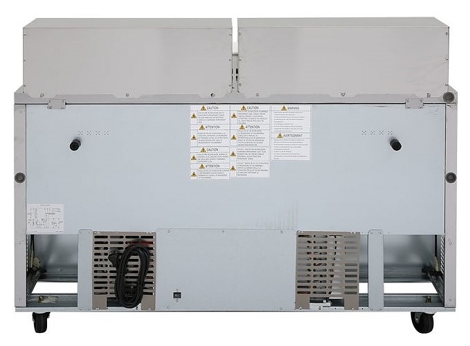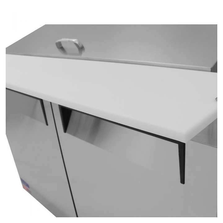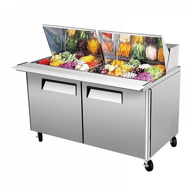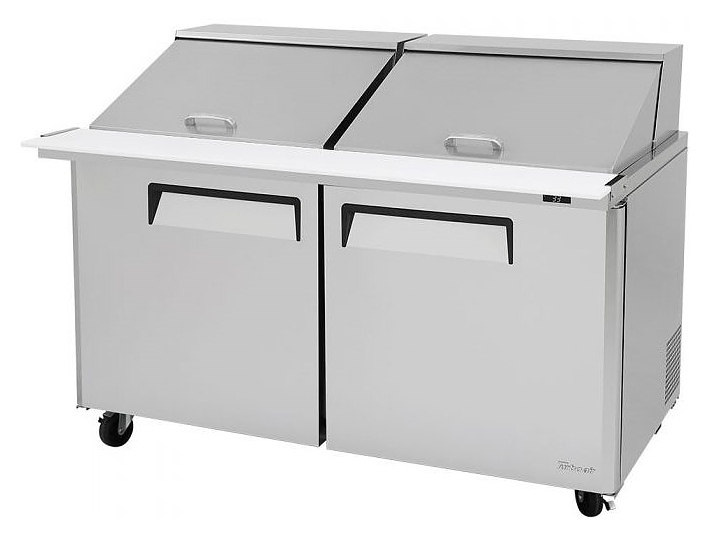 Холодильный стол Turbo air CMST-60-24 используется на предприятиях общественного питания и торговли для обработки ингредиентов, используемых для приготовления сэндвичей, охлаждения и кратковременного хранения продуктов. Модель оснащена эргономичными ручками и 4 колесами. Корпус и дверные петли выполнены из нержавеющей стали, пол - из нержавеющей стали с алюминевыми вставками по бокам и сзади, разделочная доска - из пищевого полиэтилена LDPE, уплотнение - из ABS пластика, полки - из стальной проволоки с виниловым покрытием.