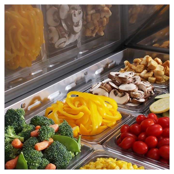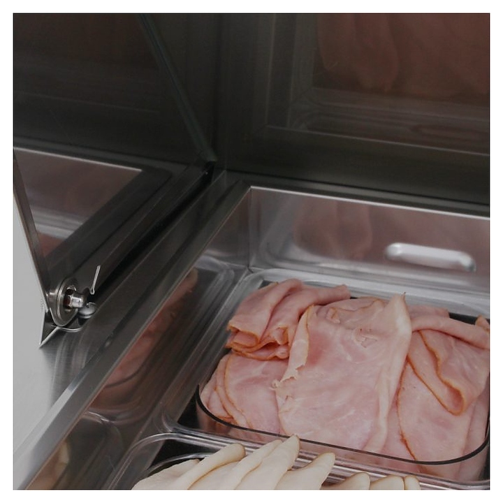 - Система охлаждения гастроемкостей распределяет холодный воздух по всей площади гастроемкостей, охлаждая не только дно, но и фронтальные, тыльные и боковые стенки: поддержание температуры продукции ниже 5°С даже при открытых крышках