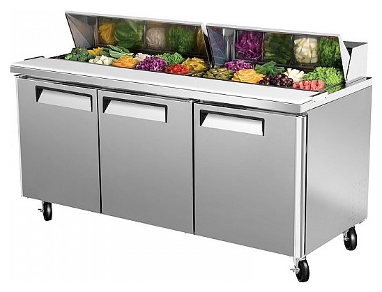 Холодильный стол Turbo air CMST-72 используется на предприятиях общественного питания и торговли для обработки ингредиентов, используемых для приготовления сэндвичей, охлаждения и кратковременного хранения продуктов. Модель оснащена эргономичными ручками и 4 колесами. Корпус и дверные петли выполнены из нержавеющей стали, пол - из нержавеющей стали с алюминевыми вставками по бокам и сзади, разделочная доска - из пищевого полиэтилена LDPE, уплотнение - из ABS пластика.