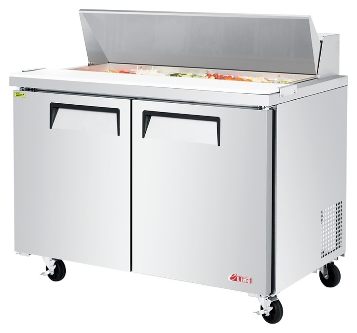 Холодильный стол Turbo air EST-48 серии E line используется на предприятиях общественного питания и торговли для кратковременного хранения предварительно охлажденных пищевых продуктов и приготовления из них сэндвичей. Модель оснащена встоенным холодильным агрегатом, холодильной камерой с распашными дверьми и столешницей с боковыми фиксаторами для разделочной доски. Вертикально ориентированный корпус за исключением задней стенки, фронтальная облицовка дверей, столешница и крышка выполнены из высококачественной нержавеющей стали SUS439 производства Posco, полка – из стального прутка с виниловым покрытием, разделочная доска – из термостойкого полиэтилена, термоизоляция – из пенополиуретана высокой плотности, испаритель с антикоррозийным покрытием.