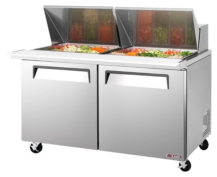 Холодильный стол Turbo air EST-60-24 серии E line используется на предприятиях общественного питания и торговли для кратковременного хранения предварительно охлажденных пищевых продуктов и приготовления из них сэндвичей. Модель оснащена встоенным холодильным агрегатом, холодильной камерой с распашными дверьми и столешницей с боковыми фиксаторами для разделочной доски. Вертикально ориентированный корпус за исключением задней стенки, фронтальная облицовка двери, столешница и крышка выполнены из высококачественной нержавеющей стали SUS439 производства Posco, полка – из стального прутка с виниловым покрытием, разделочная доска – из термостойкого полиэтилена, термоизоляция – из пенополиуретана высокой плотности, испаритель с антикоррозийным покрытием.
