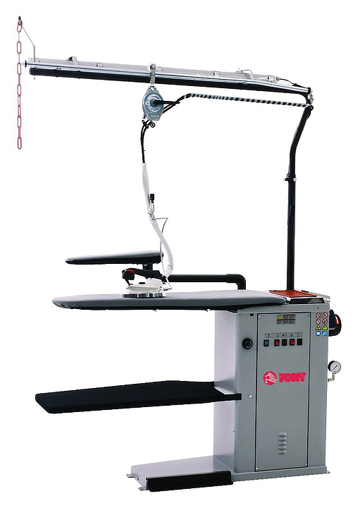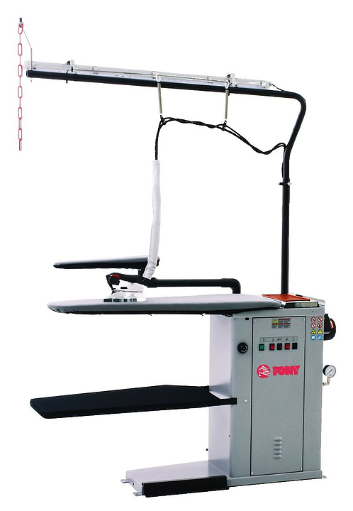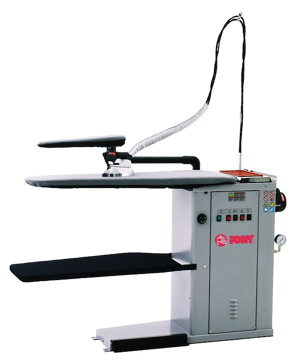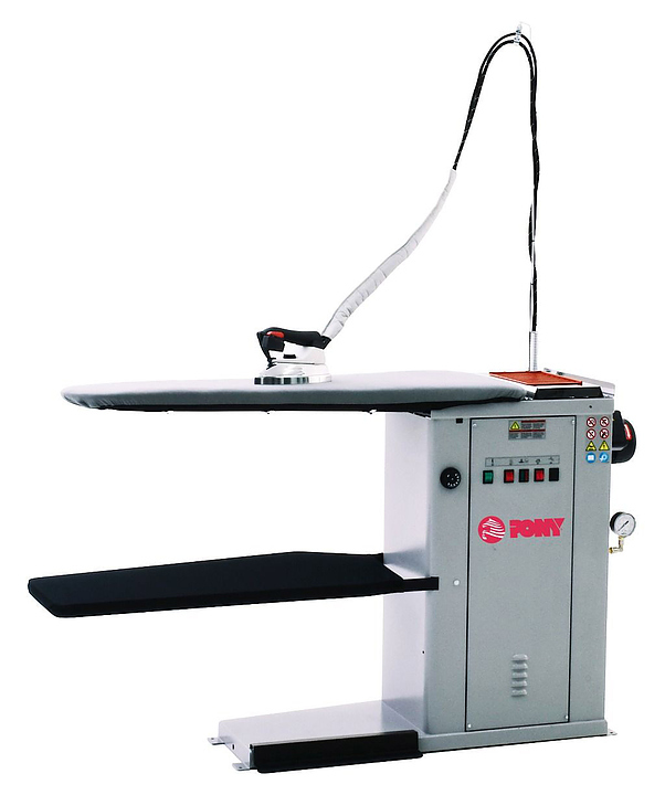 Гладильный стол PONY FVC используется в прачечных образовательных, оздоровительных заведениях, производственных предприятиях, в поликлиниках, гостиницах, детских садах, общежитиях, больницах, роддомах для глажения фасонного белья с помощью утюга. Стол оснащен паровым утюгом, аспиратором и встроенным автоматическим электрическим бойлером, который дает возможность питать от него второй утюг, расположенный на радом стоящем столе.