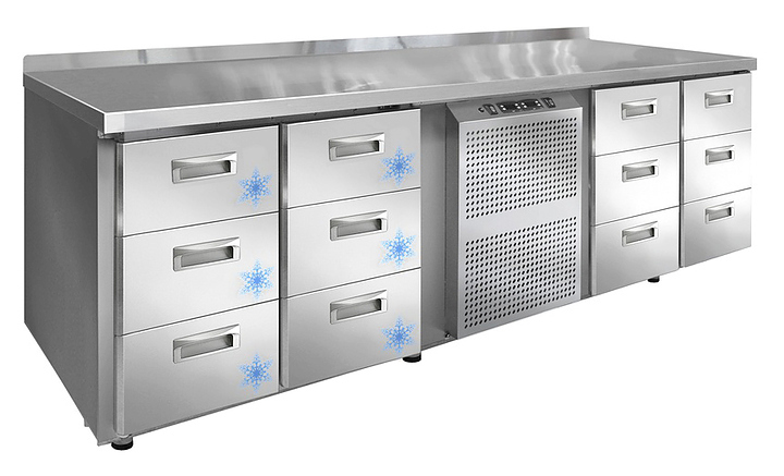 Холодильно-морозильный стол Finist КХС-700-3-3/3-3 предназначен для хранения замороженных полуфабрикатов и предварительно охлажденных готовых блюд, заготовок для салатов, молочной продукции и напитков на предприятиях общественного питания и торговли. Модель сочетает в себе 2 независимых рабочих объема и оснащена 2 панелями управления для регулировки температуры в камерах. Оборудование полностью выполнено из высококачественной пищевой нержавеющей стали.