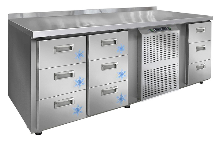 Холодильно-морозильный стол Finist КХС-700-3/6 предназначен для хранения замороженных полуфабрикатов и предварительно охлажденных готовых блюд, заготовок для салатов, молочной продукции и напитков на предприятиях общественного питания и торговли. Модель сочетает в себе 2 независимых рабочих объема и оснащена 2 панелями управления для регулировки температуры в камерах. Оборудование полностью выполнено из высококачественной пищевой нержавеющей стали.